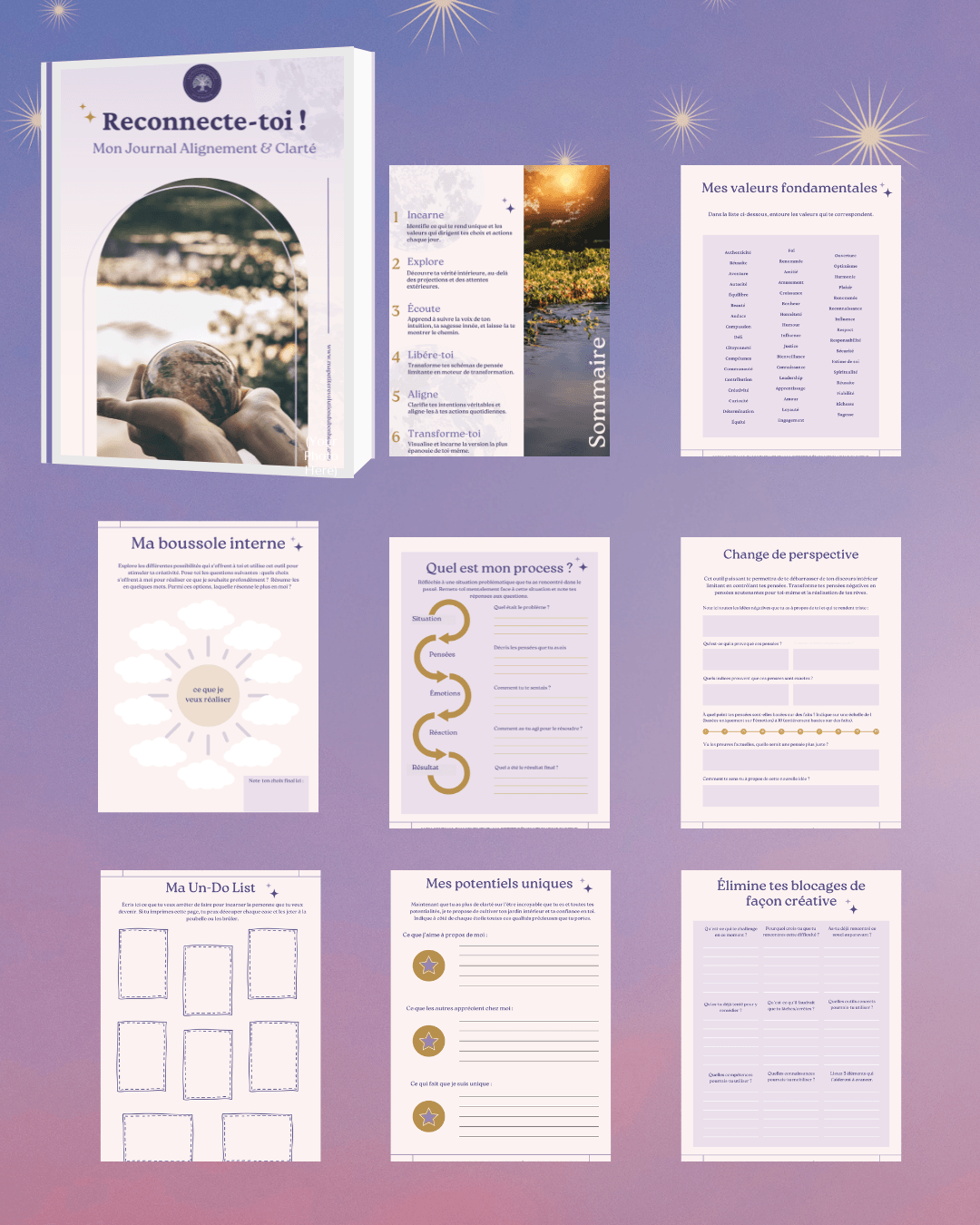 Ce journal te guide pas à pas à travers 6 techniques puissantes de développement personnel à expérimenter à ton rythme. Chaque page te permet de te reconnecter à tes valeurs, tes aspirations et ta vérité intérieure pour retrouver l'inspiration et l’alignement dans tous les domaines de ta vie.