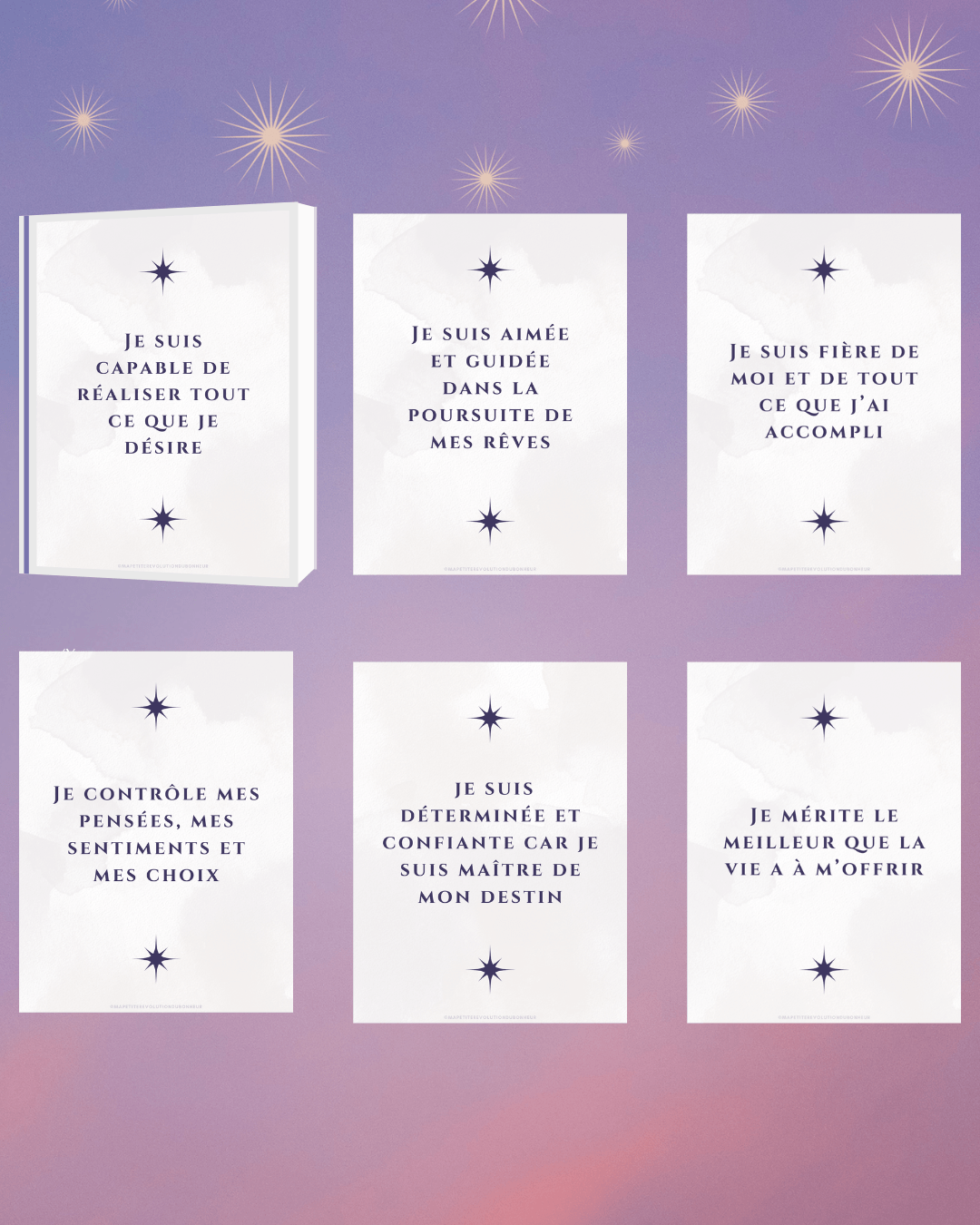 En bonus, tu reçois tes 10 cartes d’affirmations positives à imprimer ! Ces cartes t’inspireront au quotidien pour maintenir ton focus sur ce qui compte vraiment. Garde-les sur ton bureau ou près de ta table de nuit, pour rester motivée, sereine et concentrée sur tes objectifs.